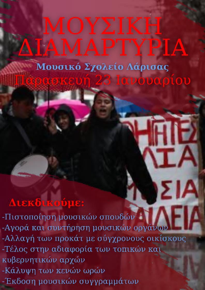 Για ακόμη μια χρονιά το Μουσικό Σχολείο Λάρισας συμμετέχει στην πανελλαδική διαμαρτυρία των Μουσικών και Καλλιτεχνικών Σχολείων . Οι μαθητές του Μουσικού Σχολείου Λάρισας μαζί με τους καθηγητές και τους γονείς μας βγαίνουμε στους δρόμους για να διεκδικήσουμε τα αυτονόητα: ασφαλείς υποδομές, σύγχρονη και δωρεάν…