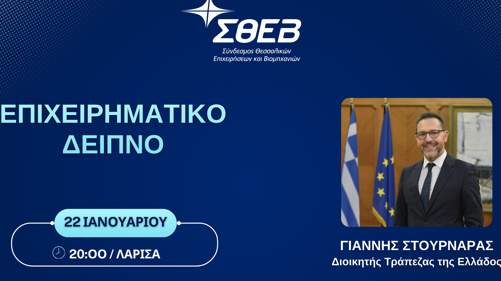 Ο Σύνδεσμος Θεσσαλικών Επιχειρήσεων και Βιομηχανιών διοργανώνει το καθιερωμένο ετήσιο επιχειρηματικό δείπνο για τα μέλη του, την Πέμπτη 22 Ιανουαρίου και ώρα 20:00, στο ξενοδοχείο «Grecotel Larissa Imperial», στη Λάρισα. Κεντρικός ομιλητής θα είναι ο Διοικητής της Τράπεζας της Ελλάδος, κ. Γιάννης Στουρνάρας. Η συζήτηση…