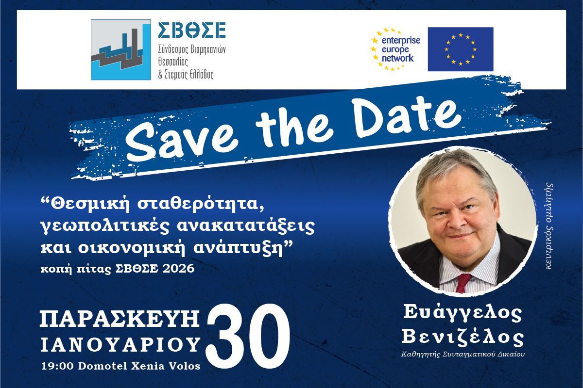 Ένα ηχηρό όνομα της πολιτικής και ακαδημαϊκής ζωής της χώρας θα δώσει το παρόν στην πρώτη μεγάλη εκδήλωση του Συνδέσμου Βιομηχανιών Θεσσαλίας & Στερεάς Ελλάδος (ΣΒΘΣΕ) για το 2026. Ο Σύνδεσμος φιλοξενεί ως Κεντρικό Ομιλητή τον τ. Αντιπρόεδρο της Κυβέρνησης και Καθηγητή Συνταγματικού Δικαίου κ. Ευάγγελο Βενιζέλο, στο πλαίσιο θεματικής…