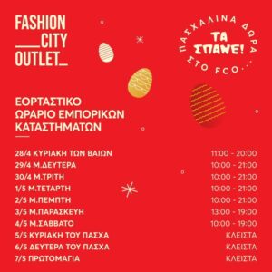 Tα καταστήματα του Fashion City Outlet συνεχίζουν να υποδέχονται τους καταναλωτές για τις Πασχαλινές αγορές τους. Τα εμπορικά καταστήματα λειτουργούν καθόλη τη διάρκεια του έτους με συνεχόμενο ωράριο από Δευτέρα έως Παρασκευή από τις 10:00 έως τις 21:00 και το Σάββατο από τις 10:00 έως τις 20:00.