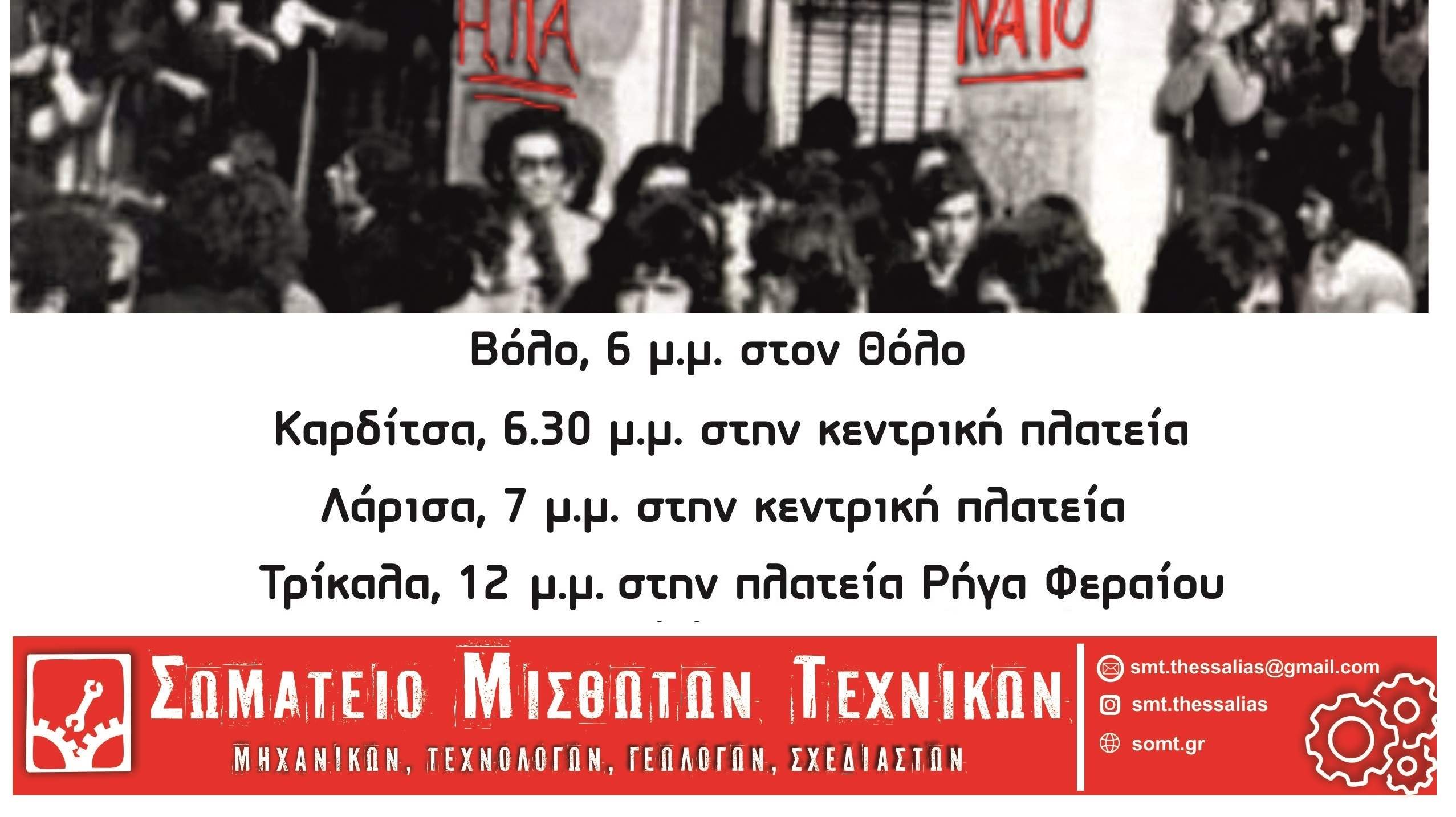 Στον δρόμο του αγώνα τιμάμε τον λαϊκό ξεσηκωμό του πολυτεχνείου που αποτέλεσε αποκορύφωμα της αντιδικτατορικής πάλης. Εμπνεόμαστε από τους αγώνες του λαού μας, συνεχίζοντας σήμερα τον αγώνα για τους ανεκπλήρωτους σκοπούς και τα ιδανικά τους! Στεκόμαστε με σεβασμό μπροστά στους νεκρούς, τους φυλακισμένους και βασανισμένους, όλους όσους συνέβαλαν στην αντιδικτατορική πάλη.