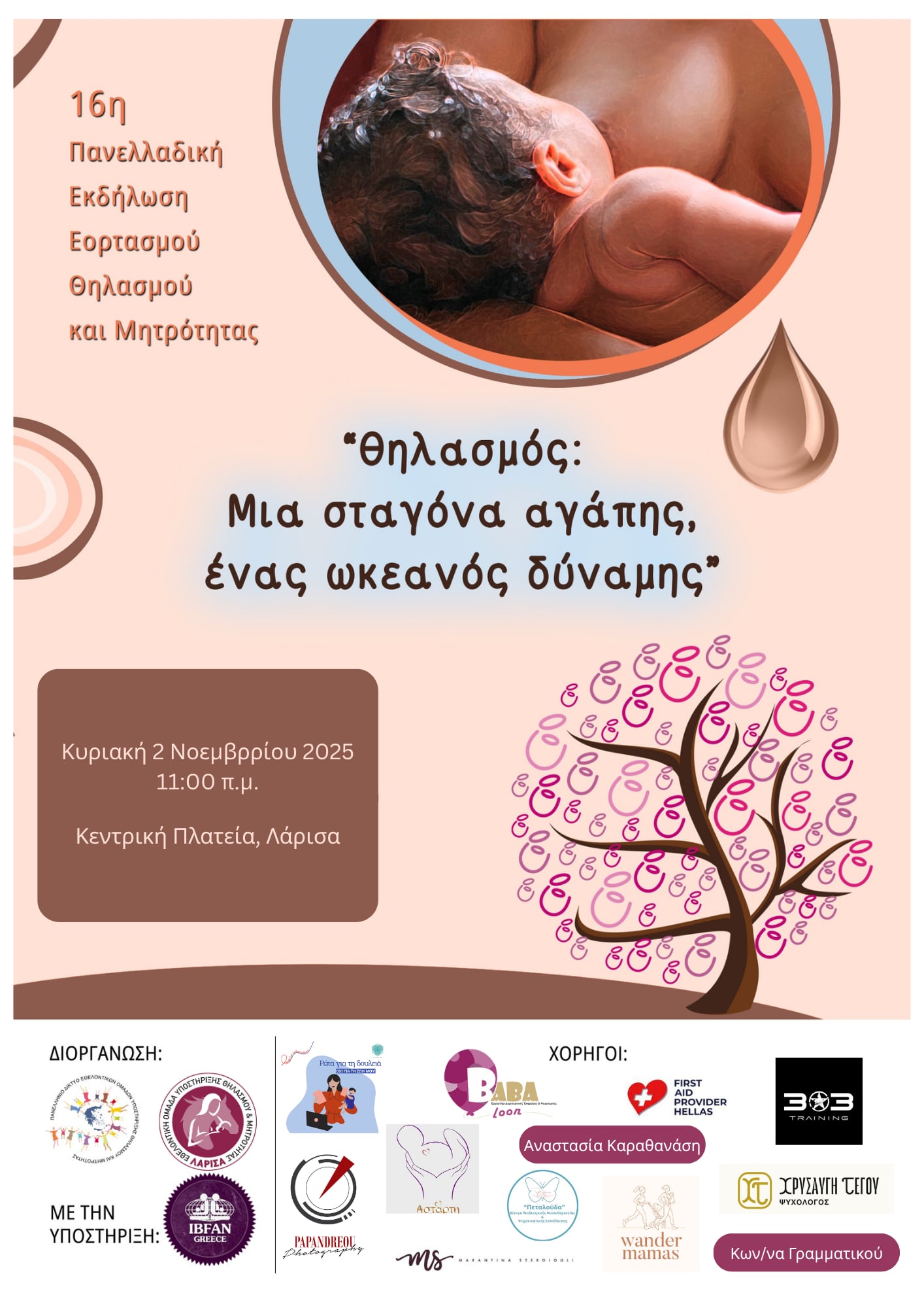 Για 16η χρονιά το Πανελλήνιο Δίκτυο Εθελοντικών Ομάδων Υποστήριξης Μητρικού Θηλασμού και Μητρότητας διοργανώνει εκδηλώσεις σε περιοχές όλης της Ελλάδας και γιορτάζει την μητρότητα. Κεντρικό σύνθημα των φετινών εκδηλώσεων είναι «Θηλασμός: Μια σταγόνα Αγάπης, ένας ωκεανός δύναμης!»