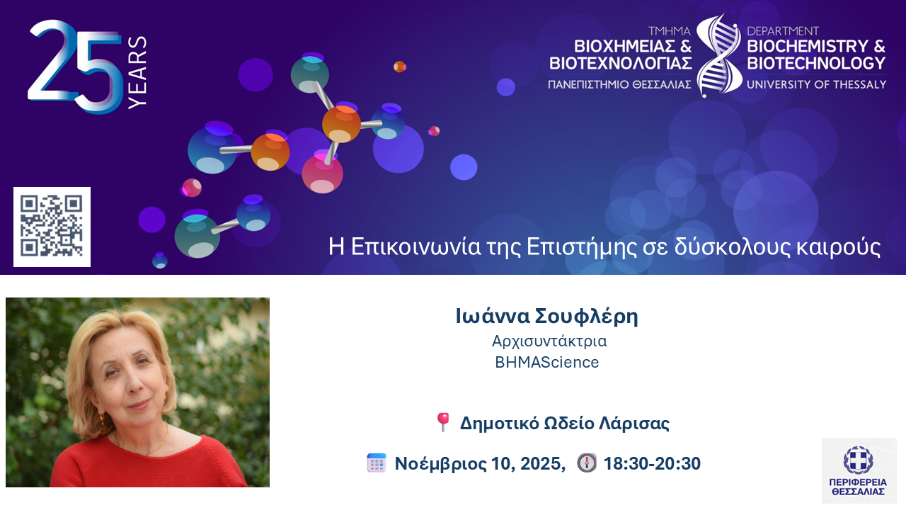 | 18:30 | Χαιρετισμός από την Καθηγήτρια Κατερίνα Μούτου, Πρόεδρο του Τμήματος Βιοχημείας και Βιοτεχνολογίας |