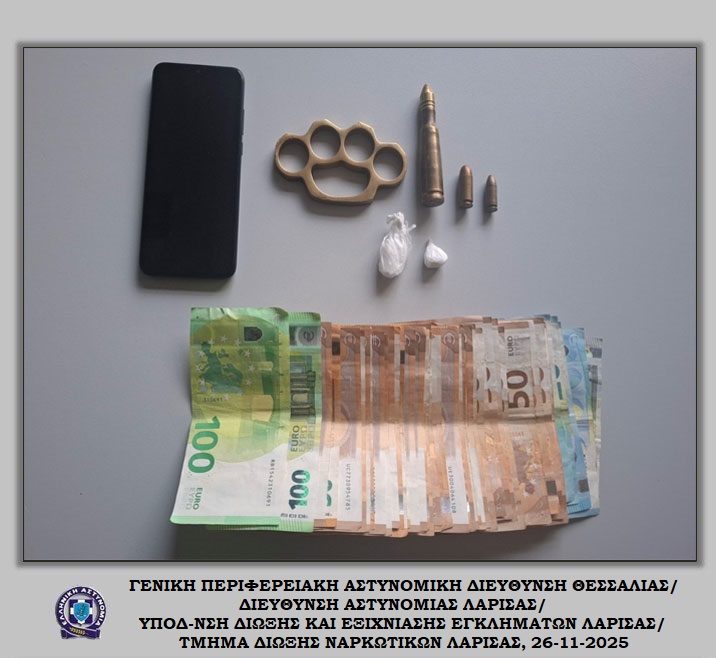 Συνελήφθησαν, χθες (25-11-2025) το απόγευμα στη Λάρισα, από αστυνομικούς του Τμήματος Δίωξης Ναρκωτικών της Υποδιεύθυνσης Δίωξης και Εξιχνίασης Εγκλημάτων Λάρισας, -2- άτομα και συγκεκριμένα ένας αλλοδαπός άνδρας και ένας ημεδαπός άνδρας, σε βάρος των οποίων σχηματίστηκε δικογραφία, κατά περίπτωση, για παραβάσεις των νομοθεσιών περί ναρκωτικών και περί όπλων, καθώς και για το αδίκημα της υπόθαλψης.