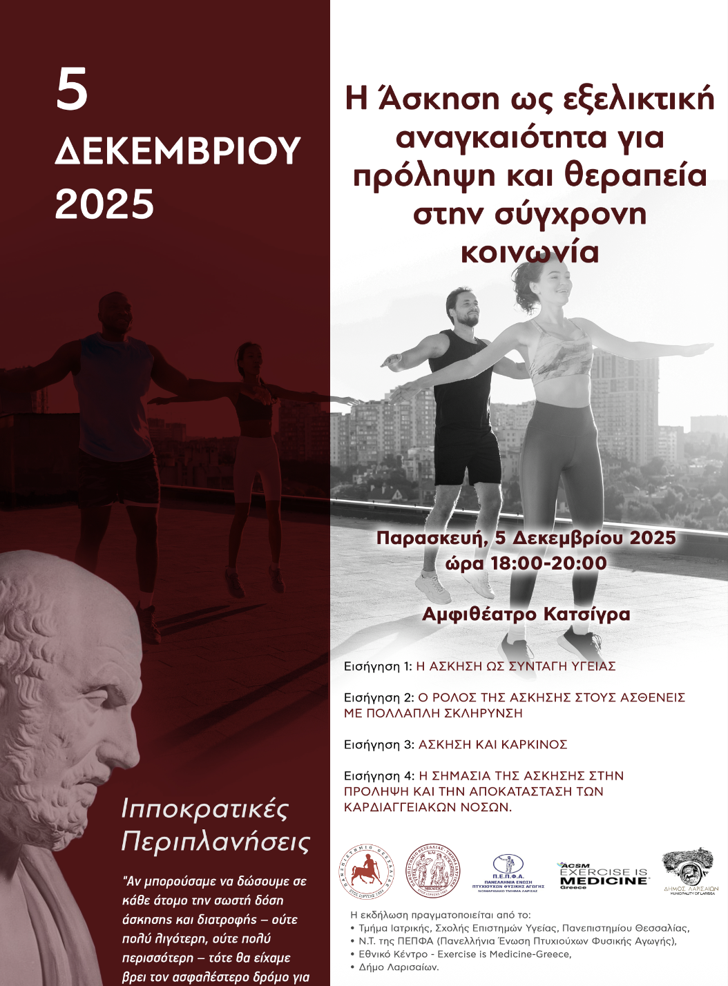 Το Τμήμα Ιατρικής της Σχολής Επιστημών Υγείας του Πανεπιστημίου Θεσσαλίας, το Ν.Τ. της ΠΕΠΦΑ (Πανελλήνια Ένωση Πτυχιούχων Φυσικής Αγωγής), το Εθνικό Κέντρο Exercise is Medicine–Greece και ο Δήμος Λαρισαίων διοργανώνουν επιστημονική εκδήλωση με θέμα:  “Η Άσκηση ως εξελικτική αναγκαιότητα για πρόληψη και θεραπεία στη σύγχρονη κοινωνία»