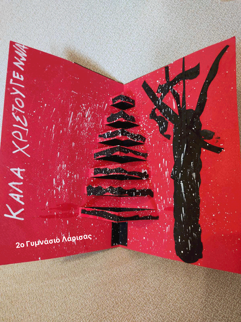 Οι μαθητές, υπό την επίβλεψη της καθηγήτριας των εικαστικών του σχολείου κ. Αντωνίου M., δημιούργησαν τρισδιάστατες χριστουγεννιάτικες κάρτες από χαρτί- εικαστικές κατασκευές ιδιαίτερης αισθητικής και παιδαγωγικής αξίας- συνδυάζοντας τεχνικές κοπής, διπλώματος και ανάγλυφης κατασκευής όπου το επίπεδο χαρτί μεταμορφώνεται σε αντικείμενο όγκου και κίνησης, ενεργοποιώντας το στοιχείο της έκπληξης.