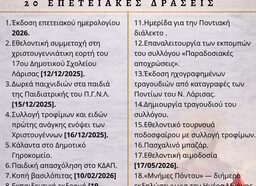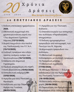 Ο Σύλλογος Ποντίων Φοιτητών και Σπουδαστών Νομού Λάρισας «Το Ροδάφνον» συμπληρώνει φέτος 20 χρόνια συνεχούς παρουσίας, προσφοράς και δράσης. Είκοσι χρόνια γεμάτα μνήμες, πολιτισμό, εθελοντισμό, κοινωνική ευαισθησία και αγάπη για την ποντιακή παράδοση. Με αφορμή αυτή τη σημαντική επέτειο, το 2026 αφιερώνεται σε έναν κύκλο 20 επετειακών δράσεων, με τίτλο «20 Χρόνια Δράσεις – Μια …