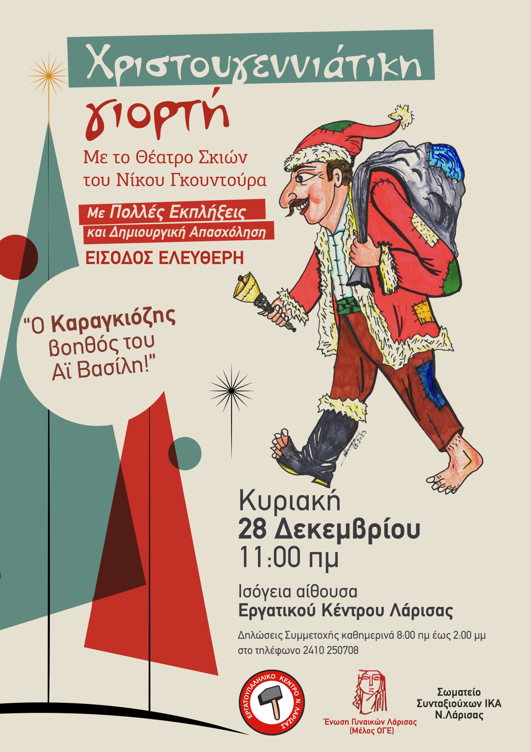 Το Εργατικό Κέντρο Λάρισας μαζί με Εργατικά Σωματεία, το Σωματείο Συνταξιούχων ΙΚΑ Ν. Λάρισας και την Ένωση Γυναικών Λάρισας (μέλος της ΟΓΕ), θα πραγματοποιήσουν για μία ακόμη χρονιά Χριστουγεννιάτικη γιορτή για τα παιδιά, την Κυριακή 28/12/2025, στις 11:00 το πρωί στην ισόγεια αίθουσα του Εργατικού Κέντρου «Τάκης Τσιόγκας». Το πρόγραμμα της εκδήλωσης θα περιλαμβάνει παράσταση …