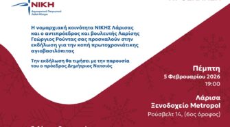 Την ερχόμενη Πέμπτη, 5 Φεβρουαρίου 2026 και ώρα 7:00 μ. μ. στο ξενοδοχείο Μετροπόλ η Νομαρχιακή Κοινότητα ΝΙΚΗΣ Λάρισας και ο Αντιπρόεδρος και Βουλευτής Λάρισας κ. Γεώργιος Ρούντας θα κόψουν την καθιερωμένη πρωτοχρονιάτικη αγιοβασιλόπιτα. Την εκδήλωση θα χαιρετίσει ο πρόεδρος του Κινήματος κ. Δημήτρης Νατσιός, μέλη του Βουλευτηρίου καθώς και άλλα σημαίνοντα στελέχη της ΝΙΚΗΣ. …