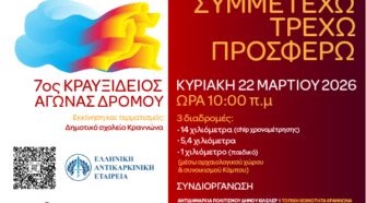 Την Κυριακή 22 Μαρτίου 2026 διεξάγεται στην τοπική κοινότητα Κραννώνα του Δήμου Κιλελέρ ο «7ος Κραυξίδειος Αγώνας Δρόμου» τον οποίο συνδιοργανώνουν η Αντιδημαρχία Αθλητισμού του Δήμου Κιλελέρ, η Τοπική Κοινότητα Κραννώνα, ο Σύλλογος Μαραθονοδρόμων Ν. Λάρισας και ο Σύλλογος Γυναικών Κραννώνα. Ο αγώνας θα διεξαχθεί σε τρεις διαδρομές των 14, 5.4 και 1 χιλιομέτρων. Εκκίνηση …