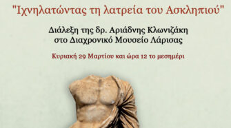 Την Κυριακή 29 Μαρτίου και ώρα 12 το μεσημέρι θα μιλήσει στο αμφιθέατρο του Διαχρονικού Μουσείου Λάρισας η δρ Αριάδνη Κλωνιζάκη, αρχαιολόγος, Προϊσταμένη του Τμήματος Εκπαίδευσης της Δ/νσης Επικοινωνίας και Υποδοχής Επισκεπτών του Εθνικού Αρχαιολογικού Μουσείου. Θέμα της διάλεξης: “Ιχνηλατώντας τη λατρεία του Ασκληπιού”. Ένα σημαντικό ερώτημα της έρευνας σχετικά με τη λατρεία του Ασκληπιού …