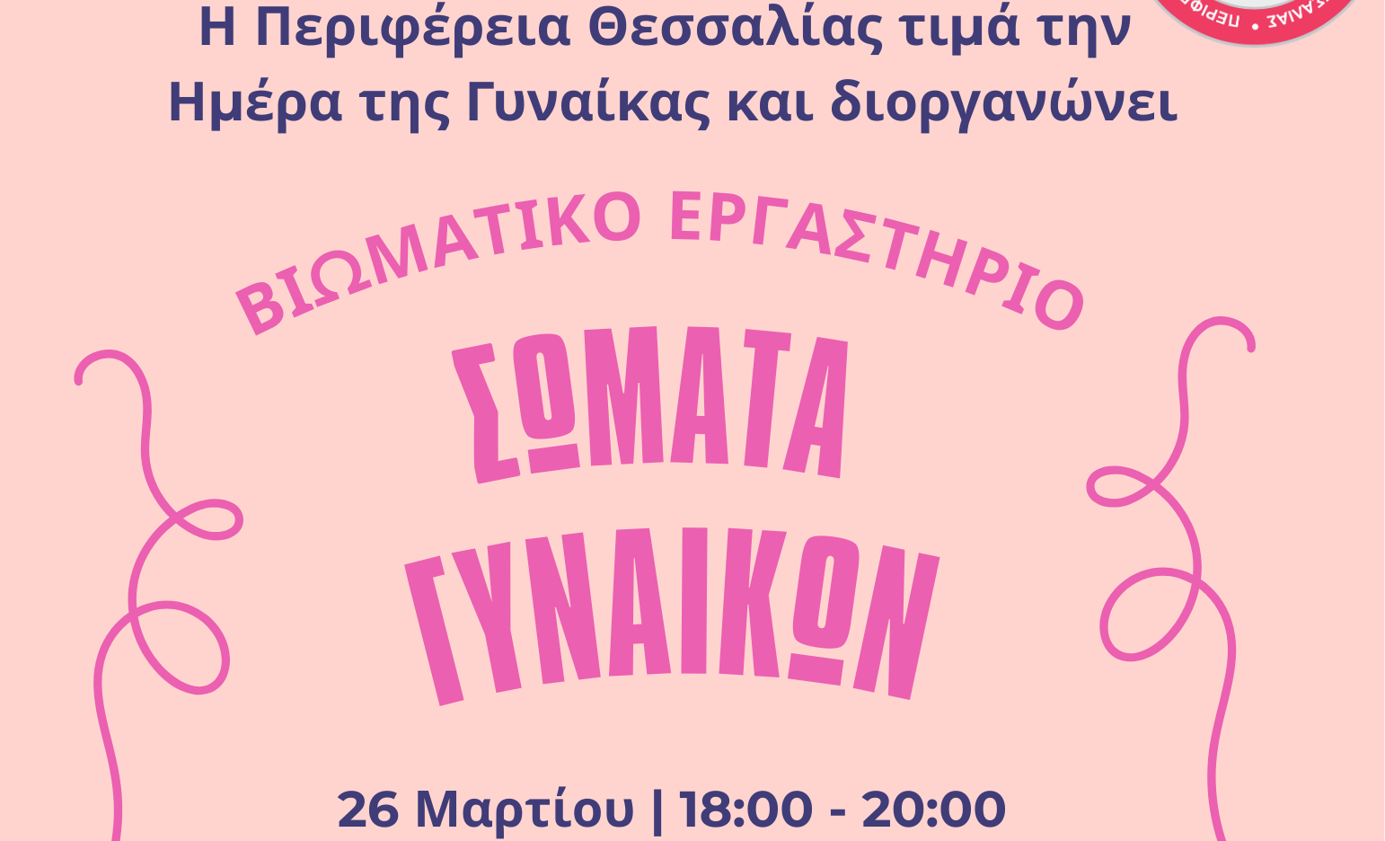 Η Περιφέρεια Θεσσαλίας, στο πλαίσιο των δράσεων της για την προώθηση της ισότητας των φύλων και την πρόληψη της έμφυλης βίας, διοργανώνει βιωματικό εργαστήριο με τίτλο «Σώματα Γυναικών», το οποίο θα πραγματοποιηθεί την Τετάρτη 26 Μαρτίου 2026 και ώρα 18:00, στη Σχολή Χορού «Lesdanseurs”, Ανθίμου Γαζή 14. Το εργαστήριο πραγματοποιείται με αφορμή την Παγκόσμια Ημέρα …