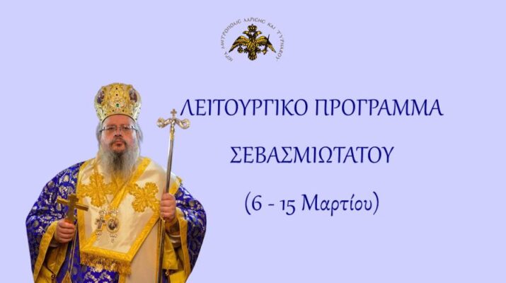 Τετάρτη 11 Μαρτίου (7.30 π.μ.), θα τελέσει την Προηγιασμένη Θεία Λειτουργία στον Ιερό Ναό Αγίας Παρασκευής Αμπελακίων. Πέμπτη 12 Μαρτίου (5.30 μ.μ.), θα τελέσει το Μυστήριο του Ιερού Ευχελαίου στον Ιερό Ναό Αγίου Αθανασίου Ομολίου. Παρασκευή 13 Μαρτίου (5.30 – 7.00 μ.μ.), θα χοροστατήσει στην Ακολουθία των Γ’ Χαιρετισμών της Υπεραγίας Θεοτόκου στον Ιερό Ναό …