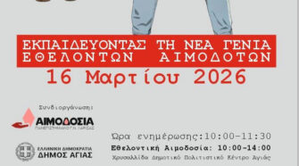 Τη Δευτέρα 16 Μαρτίου 2026 το τμήμα Αιμοδοσίας του ΠΓΝ Λάρισας θα πραγματοποιήσει Ενημερωτική Εκδήλωση με Εθελοντική Αιμοδοσία σε συνεργασία με τον Δήμο Αγιάς και την Διεύθυνση Κοινωνικής Πρόνοιας, Παιδείας, Πολιτισμού, Αθλητισμού και Εξυπηρέτησης του Πολίτη Δήμου Αγιάς. Η εκδήλωση θα φιλοξενηθεί στην αίθουσα του Δημοτικού Πολιτιστικού Κέντρου Αγιάς «Χρυσαλίδα». Η ενημερωτική παρουσίαση θα πραγματοποιηθεί …