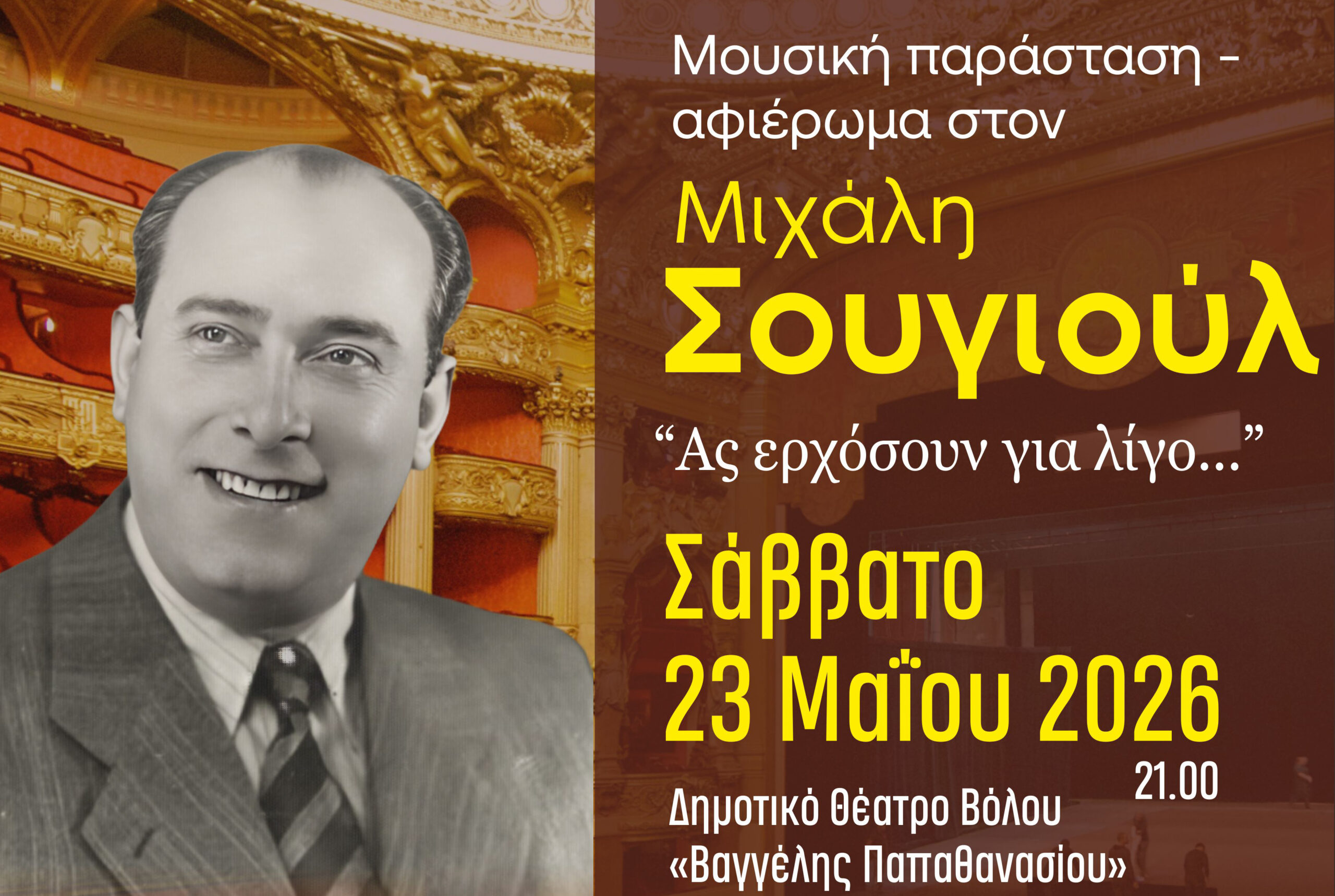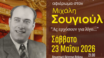 Έντονο ενδιαφέρον δείχνουν Φορείς από όλη τη Θεσσαλία για να παρακολουθήσουν τη μεγάλη μουσική παράσταση την αφιερωμένη στον σπουδαίο Έλληνα συνθέτη, που αγαπήθηκε από όλους τους Έλληνες, τον Μιχάλη Σουγιούλ , με τίτλο: “Ας ερχόσουν για …λίγο!” , που θα πραγματοποιηθεί το Σάββατο 23 Μαΐου 2026 και ώρα 21.00, στο ολοκαίνουργιο Δημοτικό Θέατρο Βόλου «Βαγγέλης …